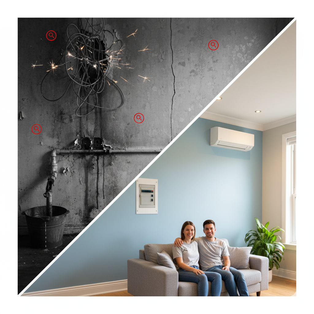 給湯器、給水・排水配管、換気設備などが古くなると故障や水漏れのリスクが高まります。さらに電気容量が現代の家電使用量と合っていないケースも多く、「ブレーカーがよく落ちる」という悩みにつながります。