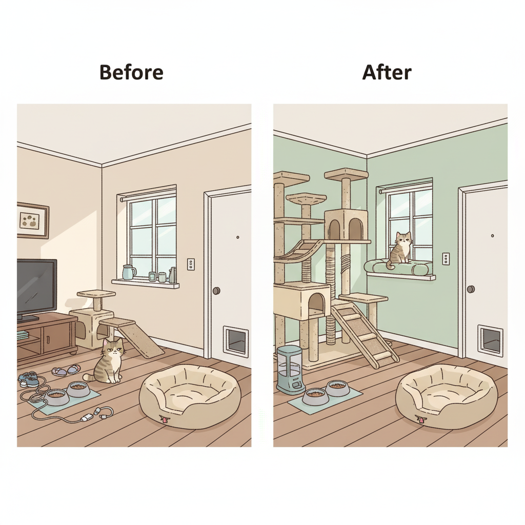 猫ならキャットウォークや小窓、犬ならベッドスペースやくつろぎコーナーなど、専用の“居場所”を作ってあげるリフォームは高い満足度があります。