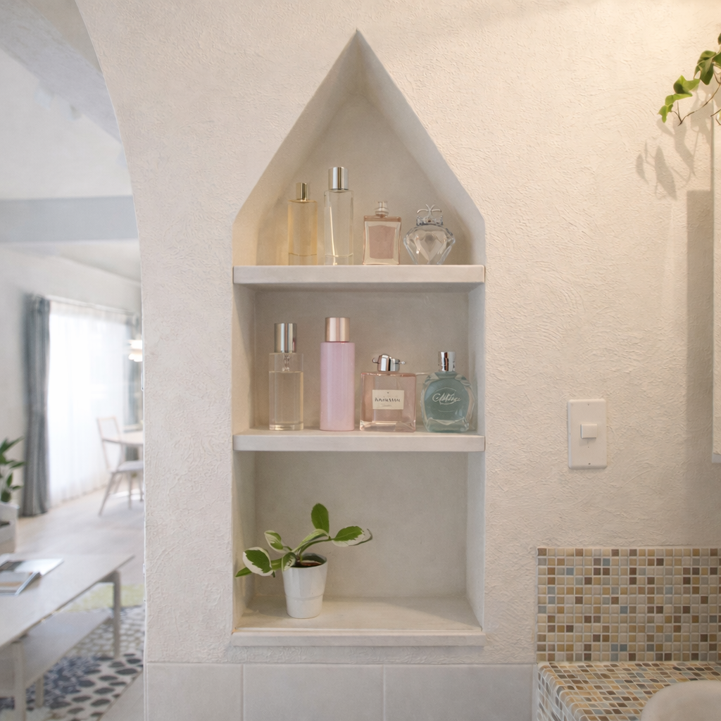 アーチ状にくり抜かれた柔らかい印象の垂れ壁。最近人気が高く、SNSでもよく見かけるデザインです。玄関やパントリー、キッチン入り口に使うと、空間に一気に“かわいさ”や“やわらかさ”が加わります。